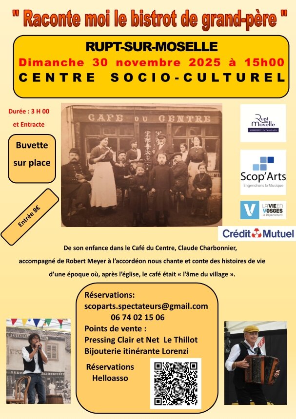 De son enfance dans le Café du Centre, Claude Charbonnier, accompagné de Robert Meyer à l’accordéon, nous chante et conte des histoires de vie d’une époque où, après l’église, le café était l’âme du village.